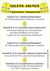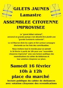 Ce matin, 4 ou 5 gilets jaunes étaient encore présents à Lamastre, dont certains ont clairement soutenu une liste aux municipales en 2014 (celle qui n’a pas eu la majorité).