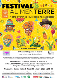 L’Université Populaire du Vivarais (UPV), pour la troisième année consécutive, a choisi de relayer le festival ALIMENTERRE proposé par le Comité Français pour la Solidarité Internationale (CFSI) qui se déroule chaque année entre le 15 octobre et le 30 novembre. Neuf films ont été sélectionnés en 2023 pour « alimenter le débat ».