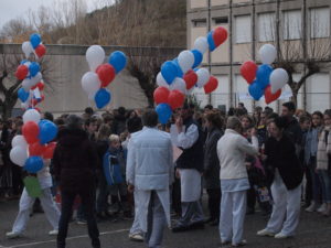 La manifestation se terminait par un lâcher de ballons (bleus, blancs et rouges!) au bout de la ficelle desquels était attachée une petite phrase sur le sujet.