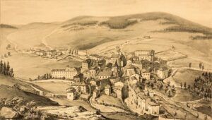 (Lalouvesc au XIXème siècle, avant la construction de la Basilique. La vieille église au centre du dessin).