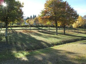 Une grande allée conduit à un amphithéâtre de gazon planté d’arbres.