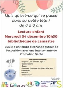 Mercredi 4 décembre à 10h30, lecture enfant et discussion autour de l’exposition « Qu’est ce qui se passe dans sa petite tête ? ». En présence de l’intervenante de Promotion santé.