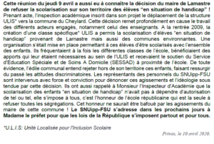 « nous avons eu à connaitre la décision du maire de Lamastre de refuser la scolarisation sur son territoire des élèves en situation de handicap. Prenant acte, l’inspection académique inscrit dans son projet le déplacement de la structure ULIS vers le Cheylard »