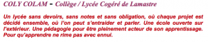Colycolam est une association travaillant à l’ouverture, dés la prochaine rentrée, d’un établissement d’enseignement secondaire visant à expérimenter des modes d’apprentissage actifs.