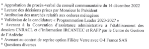 Communauté de communes du Pays de Lamastre: prochaine réunion le 7 février 2023 3 février 2023 RAD Démocratie Locale 0 Prochaine réunion du conseil communautaire le mardi 7 février 2023 salle Saint Louis à 18 heures à Nozières Ordre du jour: Vous aimerez peut-être aussi :En rouge et noir (suite 1)… Commun' infos de Lamastre - Travaux - EconomieComposition des commissions de contrôle des listes électorales - Pays de LamastreRéaction d'un élu aux propos tenus lors de la réunion du conseil communautaire du 28 septembre 2020Laurent Wauquiez fête ses 1 an sur Twitter !!!Lamastre - réunion du conseil municipal le lundi 14 avrilcommunauté de communes pays de Lamastreélusréunion