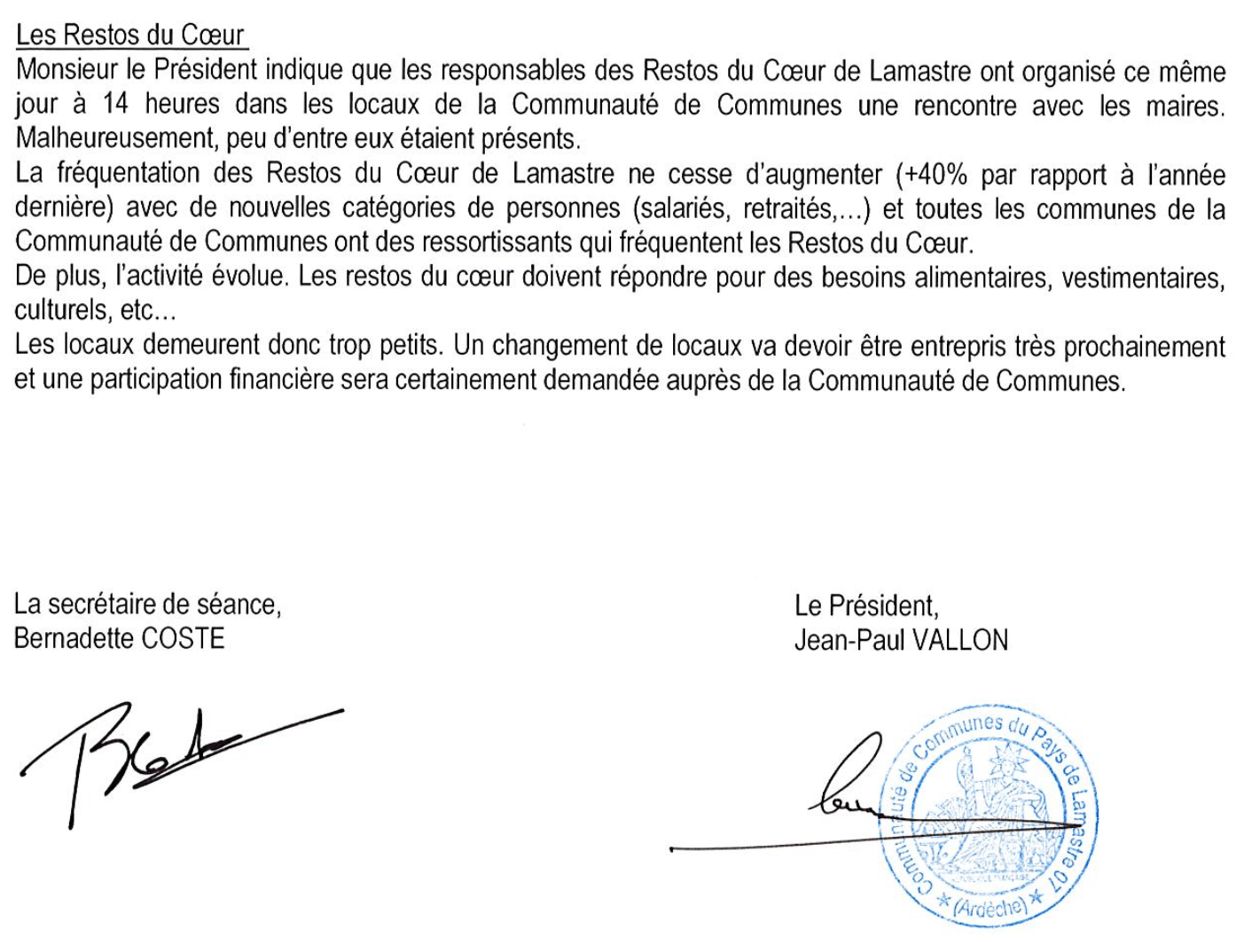 1. Dans la note concernant les Restos du Cœur, dans le PV du Conseil ComCom du 7 avril dernier, c’est rigolo : in fine, le PV indique que les locaux sont devenus trop petits. Et, en soi, ce n’est pas vrai !