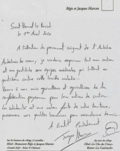 Lettre de soutien des chefs Régis et Jacques Marcon de Saint Bonnet le Froid: