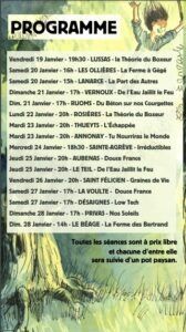 Ces projections seront suivies d’échanges avec les paysannes et les paysans organisés en groupes locaux pour chaque territoire.