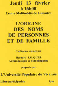 L’Université Populaire du Vivarais organise un conférence sur l‘origine des noms de personnes et de famille animée par Bernard Salques, anthropologue et ethnolinguiste.