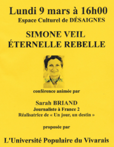 Cette conférence évoquera la personnalité de Simone Veil dont le destin fascine et intrigue.