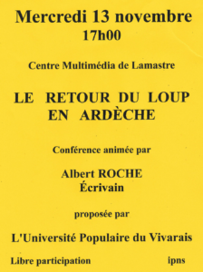 L’Université Populaire du Vivarais organise une conférence sur « Le retour du Loup en Ardèche » animée par Albert ROCHE, auteur et spécialiste de l’histoire des campagnes,