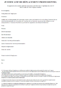 Ce justificatif est rempli par l’employeur s’il est impossible de télétravailler: pour les déplacements domicile-travail ou des déplacements entre les différents lieux de travail. Il est valable aussi pour des déplacements de nature professionnelle qui ne peuvent pas être différés.