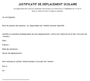 - Le justificatif de déplacement scolaire (attestation permanente à ne remplir qu’une fois sauf si l’enfant change d’école, de crèche…)