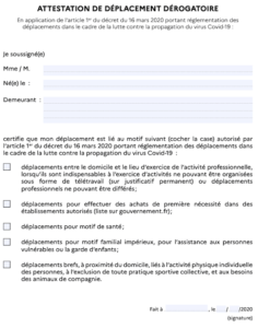 L’attestation est téléchargeable sur le site du ministère de l’intérieur service public.fr (régulièrement saturé). Elle devra être remplie « pour préciser la nature de son déplacement ».