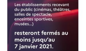 ♦ Les lieux culturels ne rouvriront pas le 15 décembre. La réouverture des musées, cinémas et théâtres est repoussée de trois semaines. Cette mesure concerne aussi « l’accueil du public dans les enceintes sportives, dans les cirques, les parcs zoologiques ou encore les salles de jeux et les casinos ».