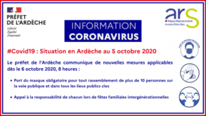 « Les mesures prises jusqu’ici ont permis de freiner la propagation du virus en Ardèche mais, depuis quelques jours, sa circulation est très active : du 25/09 au 01/10, le taux d’incidence s’élève à 50,4 pour 100 000 habitants, contre 47,4 la semaine précédente (pour mémoire le taux de passage en “alerte” est de 50).
