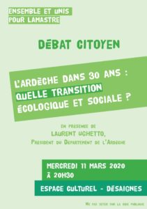 Les citoyens, les candidats de toutes listes, des communes du Pays de Lamastre sont cordialement invités à venir s’informer et débattre des contrats de transition écologique et sociale proposés par le Département de l’Ardèche.