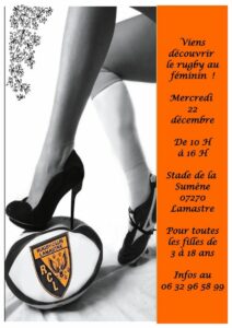 Mercredi 22 décembre de 10h à 16h, le Rugby Club Lamastrois et ses éducateurs Isabelle et Philippe, organisent une séance de découverte du rugby féminin.