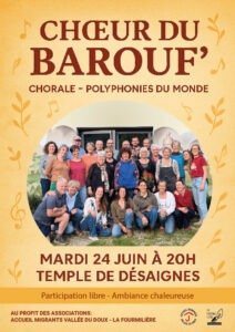 Désaignes : Chœur du Barouf’ 6 juin 2025 RAD Associations, Culture 0 Vous aimerez peut-être aussi :L’Association Culturelle de Désaignes fête ses 50 ansBibliothèque de Lamastre - Présentation de l'ouvrage "Paul Signac peintre, écrivain, voyageur"L'homéopathie - Conférence de l'Université PopulaireAtelier "Autour de la suite bureautique LibreOffice avec Linux07"Des Livres à lire (suite) proposés par un lecteurdesaignes