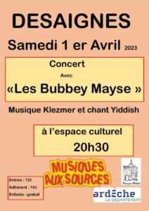 Samedi 1er avril à Désaignes: concert organisé par musiques aux sources avec les « Bubbey Mayse »