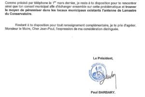 Dans une lettre du 19 février 2018, il explique aux autorités départementales que sa décision est motivée par des raisons financières et leur intime l’ordre de « libérer les locaux de toute utilisation et de tout matériel et mobilier ». Il les invite enfin à « prendre attache auprès du garde champêtre en mairie pour fixer une date de l’état des lieux de sortie ».