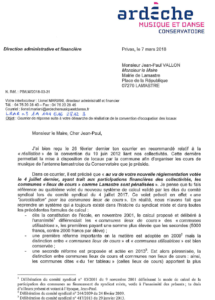 Dans sa lettre du 19 février, le maire de Lamastre reproche aux instances dirigeantes de l’école de musique de vouloir le beurre et l’argent du beurre, à savoir demander plus de participation financière aux communes d’accueil depuis le 4 juillet 2017et solliciter en plus la gratuité des locaux.