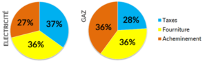La facture d’électricité est composée d’une part fixe: l’abonnement et d’une part variable proportionnelle à la quantité d’énergie consommée et de taxes et contributions qui représentent un peu plus d’un tiers de la facture.