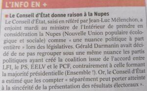 Le ministère de l’Intérieur prend acte de la décision du Conseil d’État sur le nuançage des candidats aux élections législatives. Il procédera à la modification de la grille des nuances afin de créer la nuance NUPES.