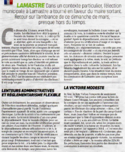 Le résultat des dernières élections municipales à Lamastre a été relaté de manière fort intéressante dans l’Hebdo de l’Ardèche du 16 Mars 2020.