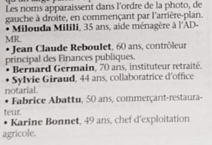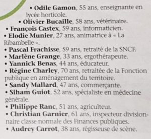 Vincent Desbos, 51ans, chauffeur de taxi, conseiller sortant ; Nathan Cros, 23 ans, collaborateur comptable ; Sylvain Weecksteen, 57 ans, gendarme retraité ; Michel Rochette, 57 ans, chef d’équipe de travaux publics, conseiller sortant ; Jean-Philippe Leynier, 43 ans, technicien méthode, conseiller sortant ; Matthieu Maneval, 31 ans, responsable bureau d’étude, conseiller sortant ; Jean-Luc Peyrard, 56 ans, commerçant, adjoint sortant.