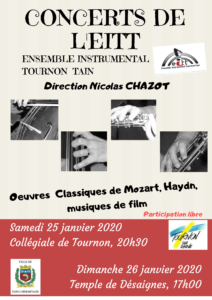 L’EITT donne deux concerts prochainement, le 25 janvier à 20H30 à la Collégiale de Tournon sur Rhône et le 26 janvier à 17H00 au Temple de Désaignes.