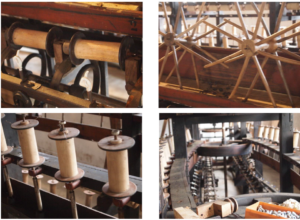 L’opération se continue au moulinage. Le fil passe sur des roquets (bobines) où il sera à nouveau dévidé pour être doublé (ou triplé).