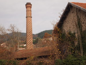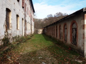 On trouve tout d’abord un grand bâtiment inoccupé contre lequel s’appuient des appentis surmontés de la fameuse haute cheminée.