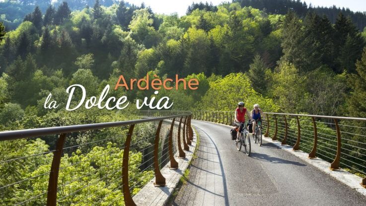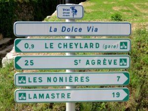 Passant d’une rive à l’autre de la rivière Eyrieux, la Dolce Via, emprunte le tracé de l’ancienne voie de chemin de fer départemental abandonnée depuis 1968.