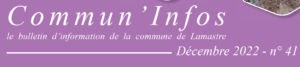 Nous venons de recevoir le journal d’information municipale Commun’infos. Il est également consultable sur le site de la mairie de Lamastre en cliquant ICI