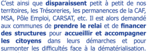 M. VALLON déplore la fermeture des services de l’État et d’autres structures à vocation publique en zones rurales. Il écrit que les communes ne peuvent pas compenser ces désengagements sans que leurs finances en soient gravement affectées. Mais pas Lamastre. Sa commune afficherait une « solidité financière lui permettant de faire face à tous ces aléas ». Bémol : « Pour l’instant et jusqu’à quand ? » Soit, mais alors nous exhortons M. le Maire a construire ou simplement aménager une Maison France Services qui remédierait à la disparition de la perception et d’autres services de l’État, comme l’ont fait la plupart des petites communes ardéchoises. Il arrive un moment où les paroles ne suffisent plus …