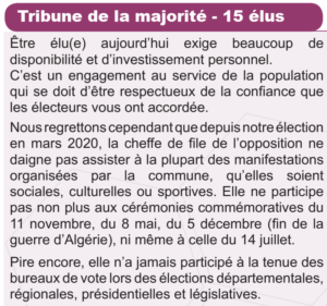 La tribune du maire et de sa majorité (15 élus) contient une attaque inadmissible,  scandaleuse et révoltante contre « la cheffe de file de l’opposition ».