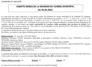 Lamastre – compte rendu du conseil municipal du 20 juin 2022 23 juin 2022 RAD Compte rendu de conseil municipal 0 Pour consulter l’intégralité du compte rendu cliquez sur le lien ci-dessous: Compte rendu du conseil municipal du 20 juin 2022 RAD Vous aimerez peut-être aussi :Jérome Blanc termine 6ème du championnat de France de Trial 4 x 4Echange avec Daniel Barbarossa - LégislativesCommunauté de communes Lamastre - "Polémiquer ou dénoncer : Telle est la question" ?ENSEMBLE ET SOLIDAIRES - Loto à LamastreRencontre entre la liste "Ensemble et unis pour Lamastre" et les associations communales.compte renduconseil municipalélusLamastremaire