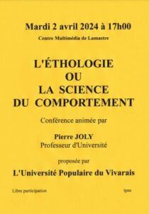 L’Université Populaire du Vivarais organise une conférence au Centre Multimédia de Lamastre le Mardi 2 avril à 17h00 sur le thème de « l’Ethologie ou la science du comportement » animée par Pierre JOLY, – Professeur retraité de l’Université Claude Bernard et de l’Ecole Normale Supérieure de Lyon, membre de l’Institut Universitaire de France dans les spécialités des sciences du comportement, de la conservation du patrimoine naturel et de l’écologie scientifique, directeur pendant 10 ans du Laboratoire d’Ecologie des Hydrosystèmes naturels et anthropisés,- qu’il présente ainsi: