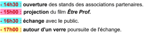 La présentation des associations sera suivie du film  » Être Prof  » et d’un échange sur le thème de l’Éducation : rendre accessible le Savoir à tous. Découvrir et s’ouvrir au champ des possibles. Moyen d’émancipation individuelle et collective.