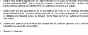 Lamastre – réunion du conseil municipal le lundi 14 avril 13 avril 2025 RAD Démocratie Locale 0 Réunion du conseil municipal en date du lundi 14 avril 2025 à 20h30à la mairie de Lamastre. Ordre du jour :Vous aimerez peut-être aussi :Lamastre - pour un premier conseil municipal il tient toutes ses promesses...Législatives: résultats dans la communauté de communes du Pays de LamastreLamastre - prochaine réunion du conseil municipalConseil municipal Lamastre: On n'y mélange pas les torchons et les serviettes !La vidéo-protection à l'ordre du jour du dernier conseil municipal de Lamastreconseil municipal