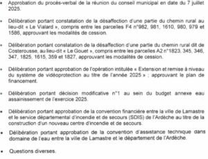 Lamastre – réunion du conseil municipal le lundi 29 septembre 26 septembre 2025 RAD Démocratie Locale 0 Réunion du conseil municipal en date du lundi 29 septembre 2025 à 20h30 à la mairie de Lamastre. Ordre du jour : Vous aimerez peut-être aussi :Législatives: résultats dans la communauté de communes du Pays de LamastreRéunion communauté de communes le 29 juin 2017Rencontre Préfet - Associations des maires du départementCagnotte de soutien "Lamastre de coeur"Réunion du conseil municipal Lamastre le 18 février 2019 conseil municipal