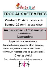 Lamastre – Troc aux vêtements des Odettes & co les 28 et 29 avril 16 avril 2023 RAD Infos Rassemblement autour du Doux 0 Au bar l’Estaminet à LamastreVous aimerez peut-être aussi :Le Mastrou à l'arrêt sur décision du préfet - les incendies le long de la voie continuent !Lamastre : le centre de vaccination a fermé ses portesMeilleurs voeux 2020Interdiction de l’emploi du feu sur tout le département de l’Ardèche à partir du 01 février 2022Rappel des règles d'emploi du feu - Préfecture de l'ArdècheLes Odettestrocvêtements