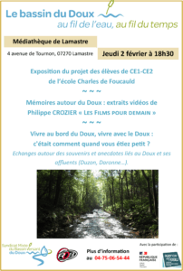 Le bassin du Doux au fil de l’eau, au fil du temps à la médiathèque de Lamastre 30 janvier 2023 RAD Culture 0 À la médiathèque de Lamastre le 2 février 2023Voir aussi il-y-a-59-ans-le-3-août-1963-le-Doux-la-crue-du-millénaire Vous aimerez peut-être aussi :"La Syrie, hier, aujourd'hui et demain ?" - conférence"Que d'eau, que d'eau !"(bis) - le Condoie à LamastreEnsemble et Solidaire UNRPA Lamastre : ThéâtreLamastre - conférence de l'Université Populaire: le Brésil, un géant en panne ?Conférence de l'Université Populaire du VivaraisbibliothèqueDouxmédiathèque