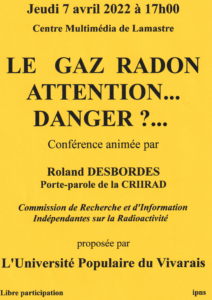 La CRIIRAD (Commission de Recherche et d’Information Indépendantes sur la Radioactivité) est une association à but non lucratif, fondée en 1986. Son objet est d’améliorer l’information et la protection du public contre les rayonnements ionisants, la radioactivité naturelle et artificielle. Roland Desbordes, scientifique, ancien président de la CRIIRAD, en est désormais le porte-parole.