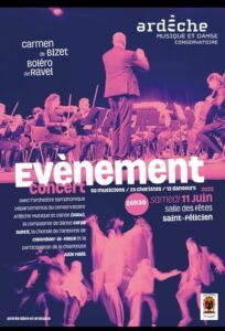 Depuis sa création, l’Orchestre Symphonique départemental de l’Ardèche qui regroupe les élèves du Conservatoire Ardèche Musique et Danse, rayonne sur toute l’Ardèche et donne des concerts gratuits autour d’œuvres prestigieuses. On se souvient notamment du « Carmina Burana » (2017) de Carl Orff sur le site de la Grotte Chauvet, « l’Aïda » (2018) de Verdi, dans le cadre d’une collaboration avec la Compagnie Emilie Valantin de Théâtre de Marionnettes ; « le Carnaval des Animaux » (2019) de Camille Saint-Saëns, avec la Compagnie Interne de Danse du Conservatoire, «Orphée aux enfers» en 2021.