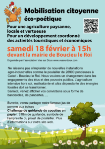 Mobilisation citoyenne à Boucieu le Roi contre un projet de poulailler industriel 16 février 2023 RAD Militant, Vie Économique et emploi 0 publié à la demande de l’association Vue sur Douxplus d’informations sur http://www.vuesurdoux.com/ Vous aimerez peut-être aussi :Carrière de Lamastre - Interview: "Ce n'est pas moi M'sieur, c'est l'autre..."Communiqué Cfdt Hôpital - Rassemblement place Seignobos le 8 septembre"J'Veux du Soleil" à LamastreFestival Mélodie des Mots - Boucieu le RoiNoz'Ateliers à Nozières - invitation à inauguration et portes ouvertes le 19 septembre 2020Boucieu le Roimobilisationpoulailler