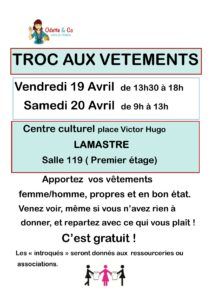 L’association Odette and Co organise son troc aux vêtements de printemps vendredi 19 et samedi 20 Avril au centre culturel à Lamastre, salle 119.