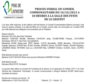 Pays de Lamastre – Procès-verbal de la réunion du conseil communautaire du 10 octobre 2023
