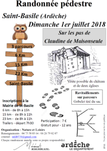 Vous avez peut-être déjà participé, l’an dernier, à notre randonnée pédestre « Sur les pas de Claudine de Maisonseule », à Saint-Basile. Nous vous en remercions et nous espérons vous revoir cette année, puisque notre association Nature et Loisirs a décidé de renouveler cette animation le dimanche 1 juillet